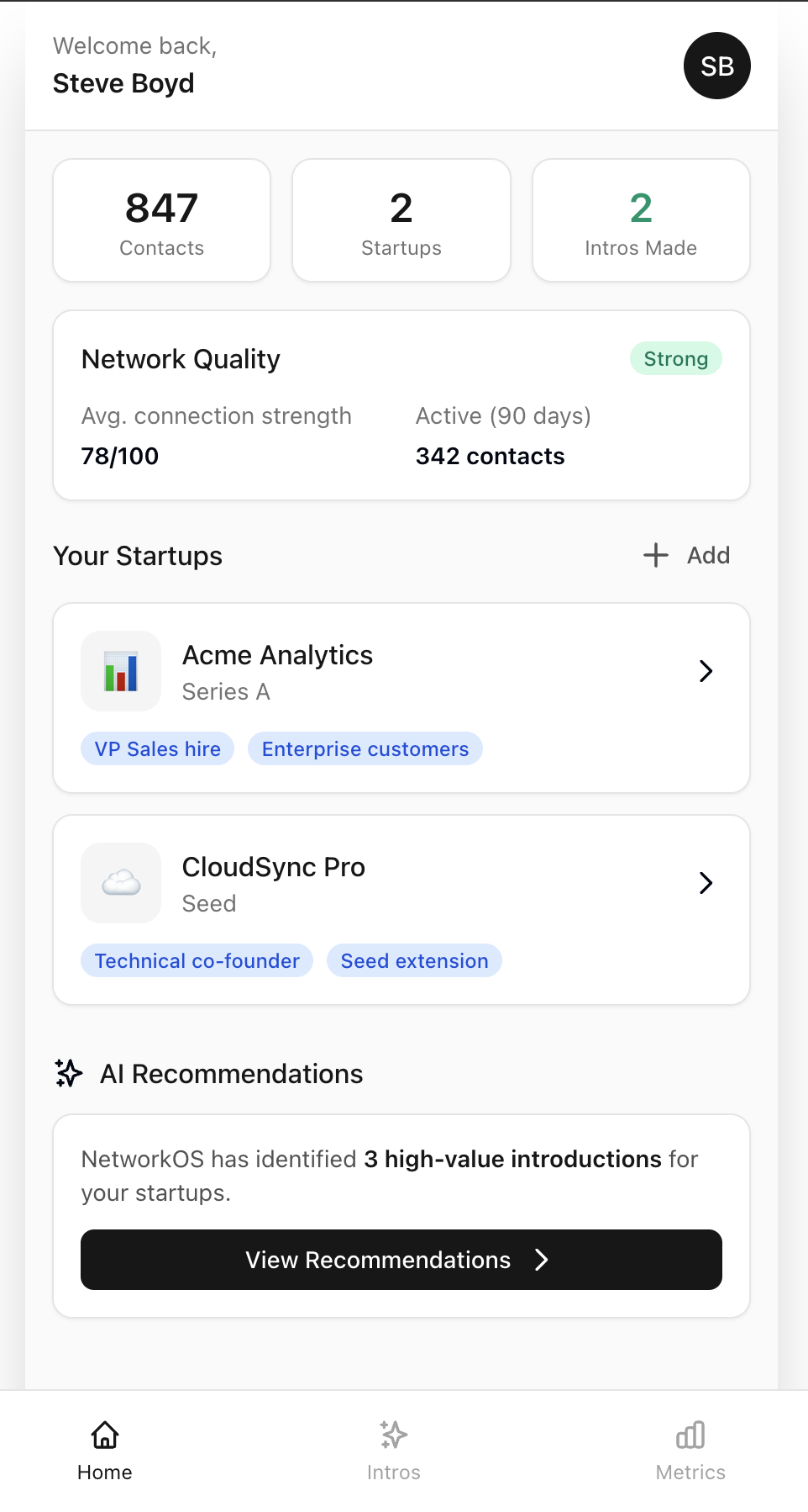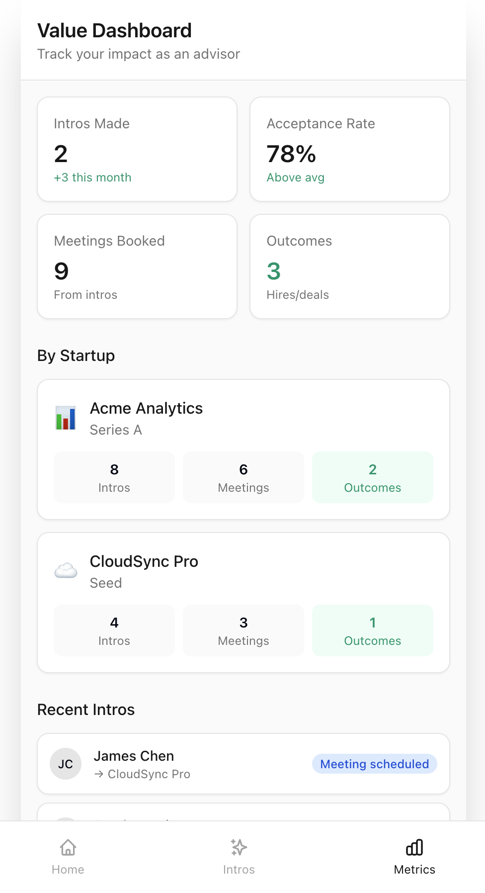 See every company you advise in one view. Track your startups, monitor network quality, and get AI-powered intro recommendations—all at a glance.