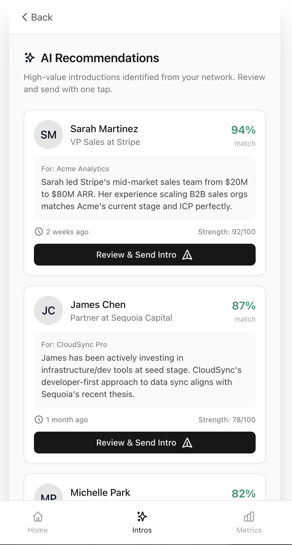 AI analyzes your network to surface high-value introductions. See match scores, context, and why each connection matters for your startups.